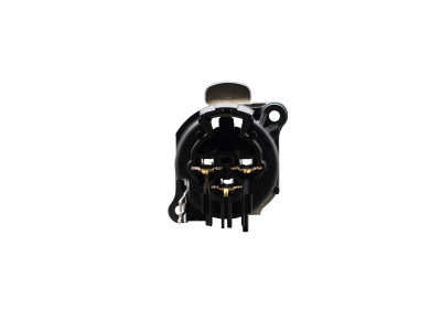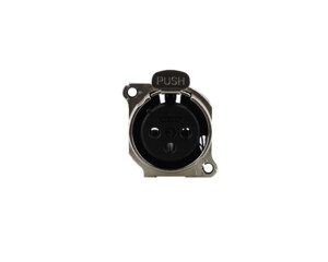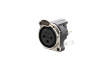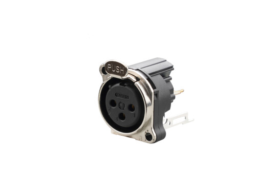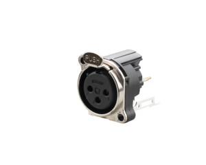 3 pole female XLR receptacle, grounding: separate ground contact to mating connector shell and front panel, vertical PCB mount