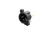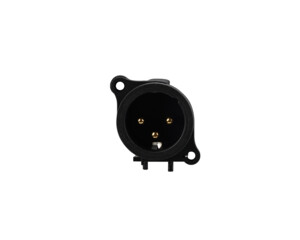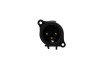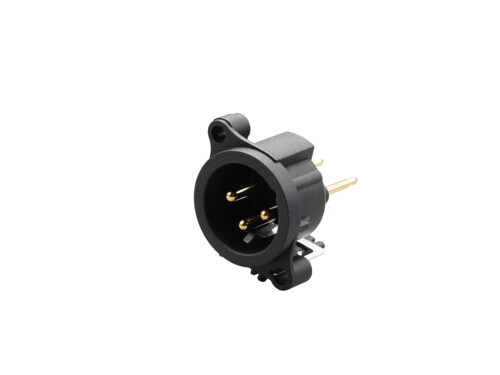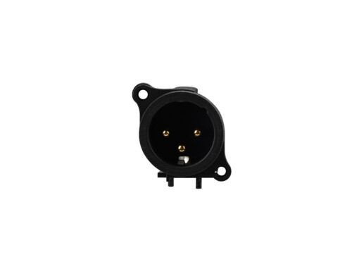 3 pole male XLR receptacle, grounding: separate ground contact to mating connector shell and front panel, vertical PCB mount